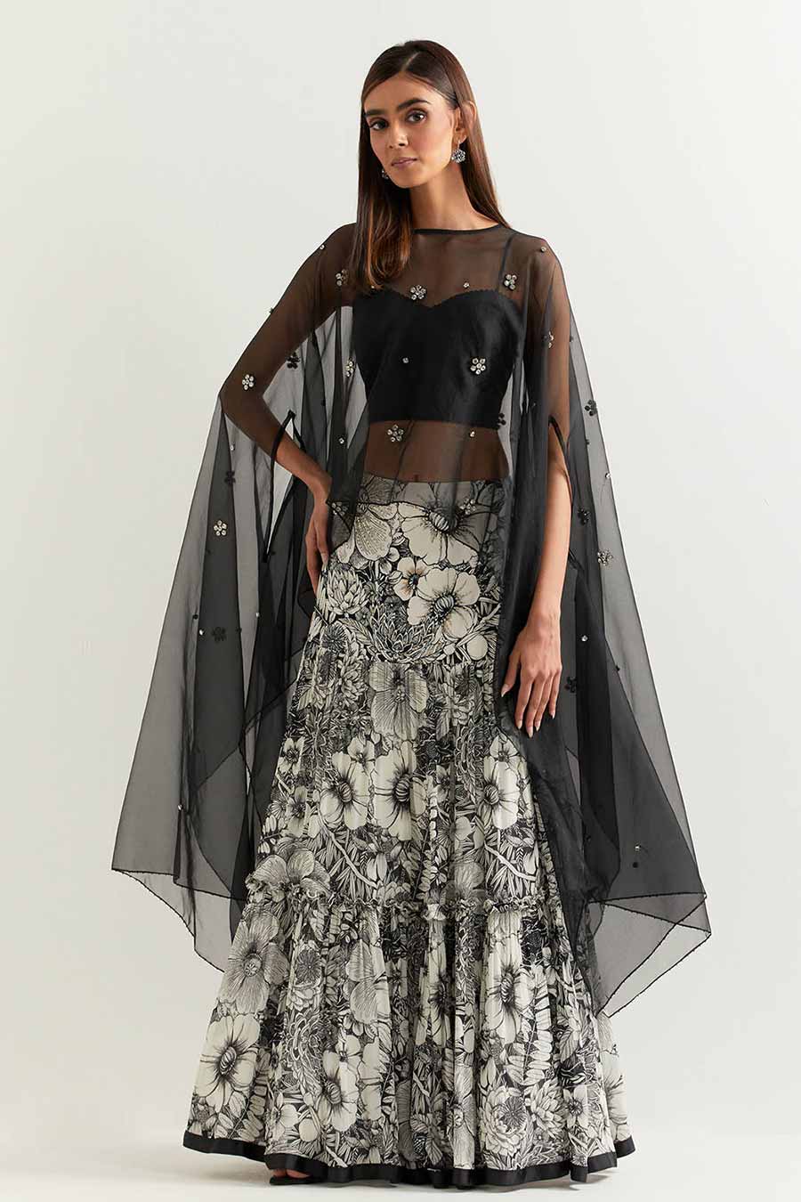 Black Embellished Organza Cape With Printed Skirt