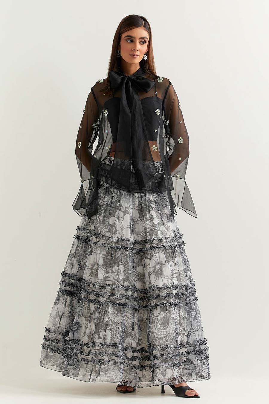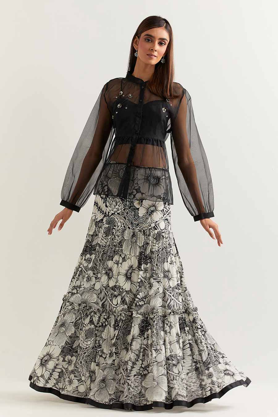 Black Embellished Organza Top With Printed Skirt
