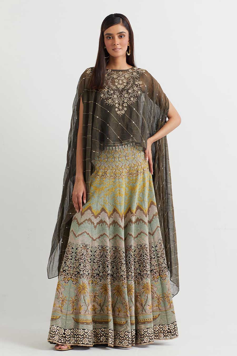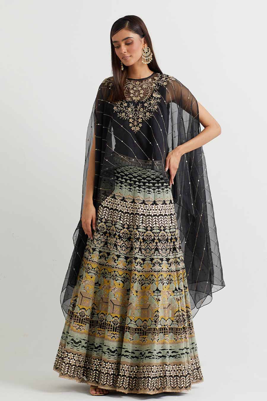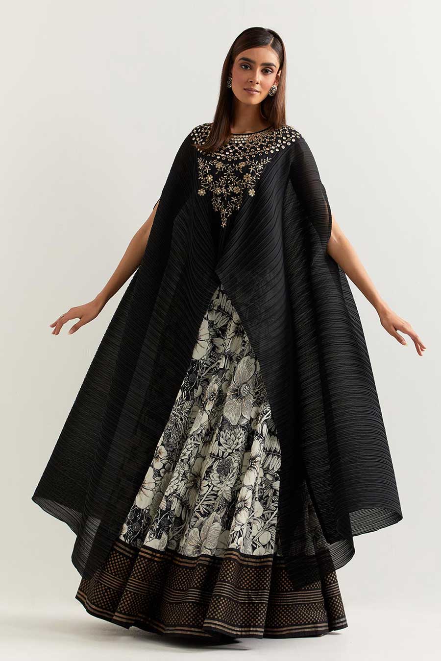 Black Embroidered Cape & Cross Stitch Skirt Set