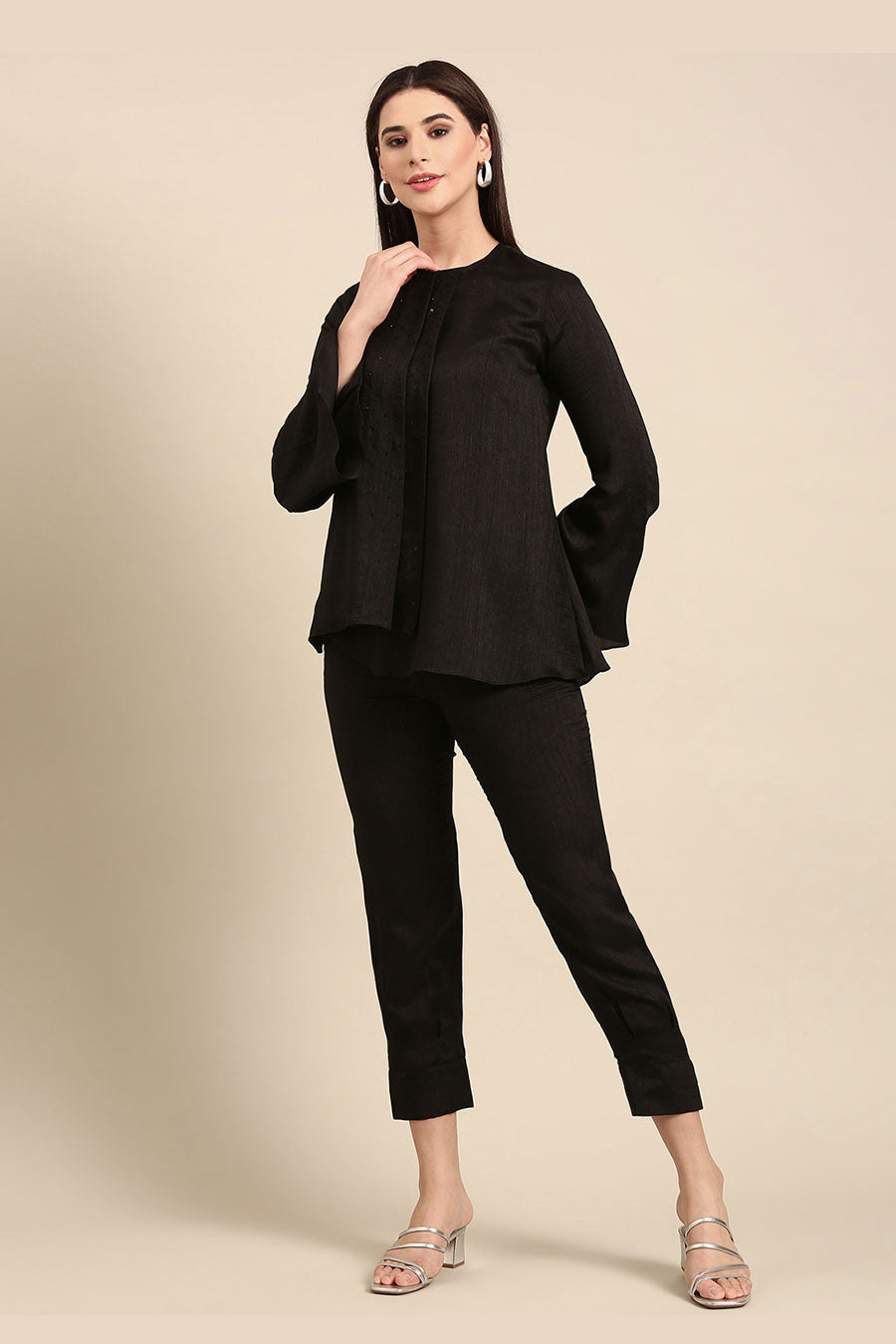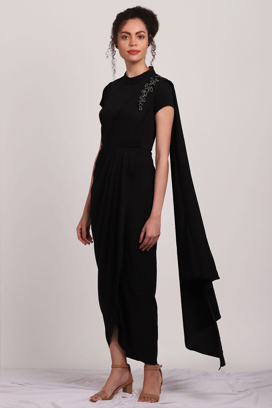 Black Pre-Draped Saree With Embellished Gold Blouse