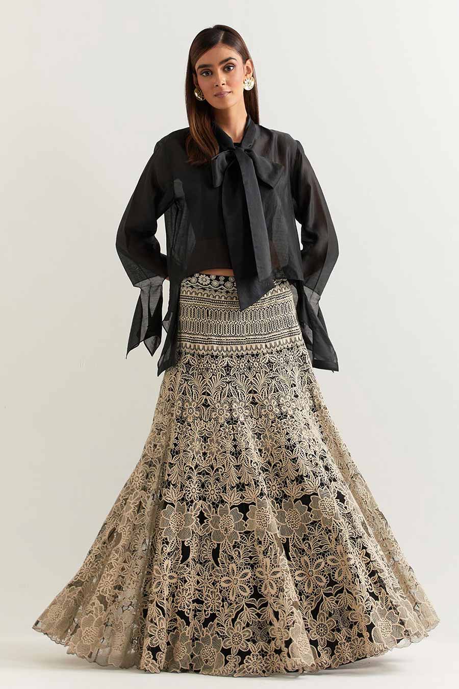 Black Sohan Printed Bralette, Shrug & Gharara Co-Ord Set