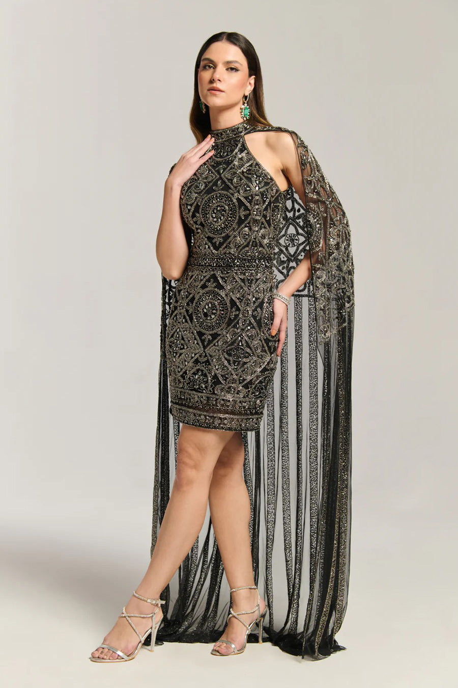 Midnight Queen Black Embellished Cape Dress