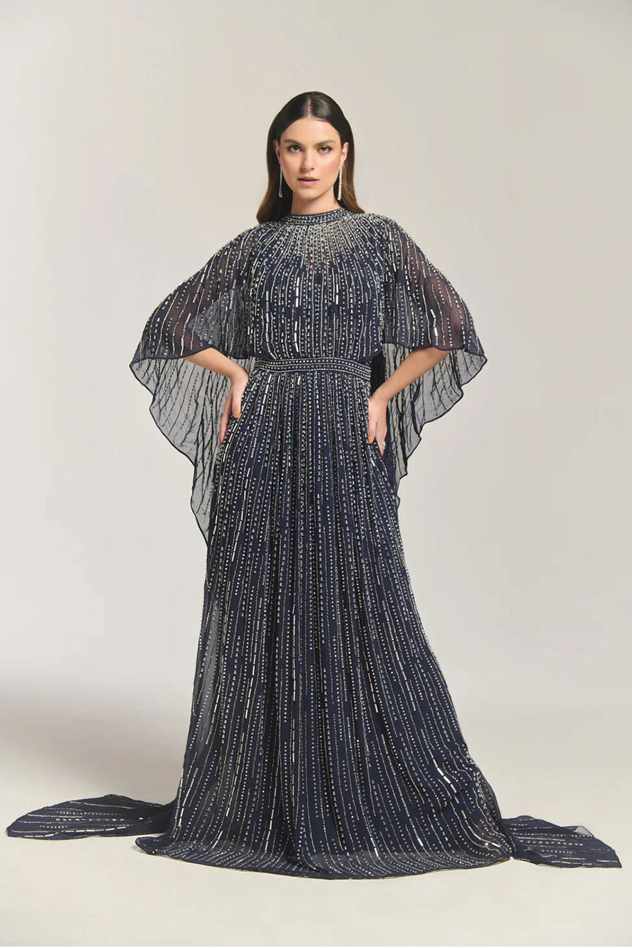 Gold Bead Embellished Cape Gown