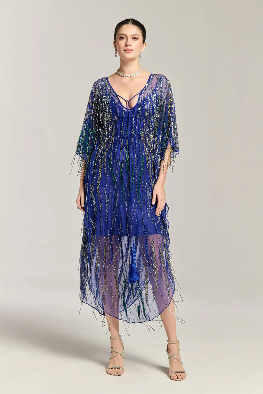 - Vertical lines of sequins and beads in blue, gold and green creates a fringe-like effect