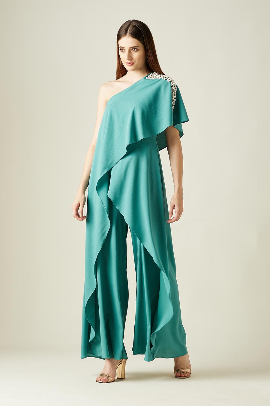 Pearl Embellished Sea Green Layered Jumpsuit