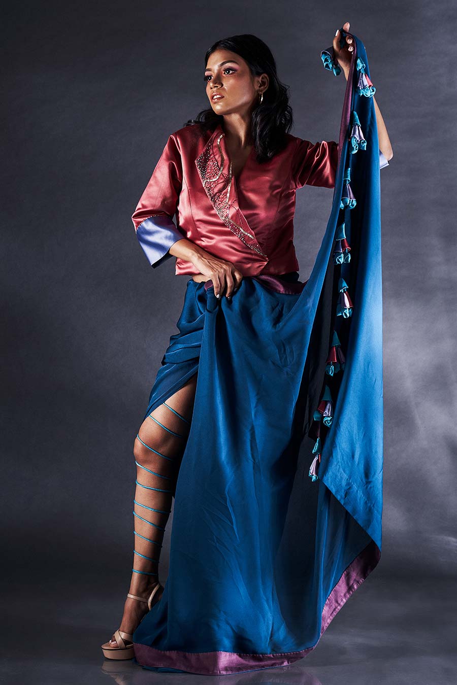 • Adorned with hand-embroidered turquoise beads and golden sallis work on collar