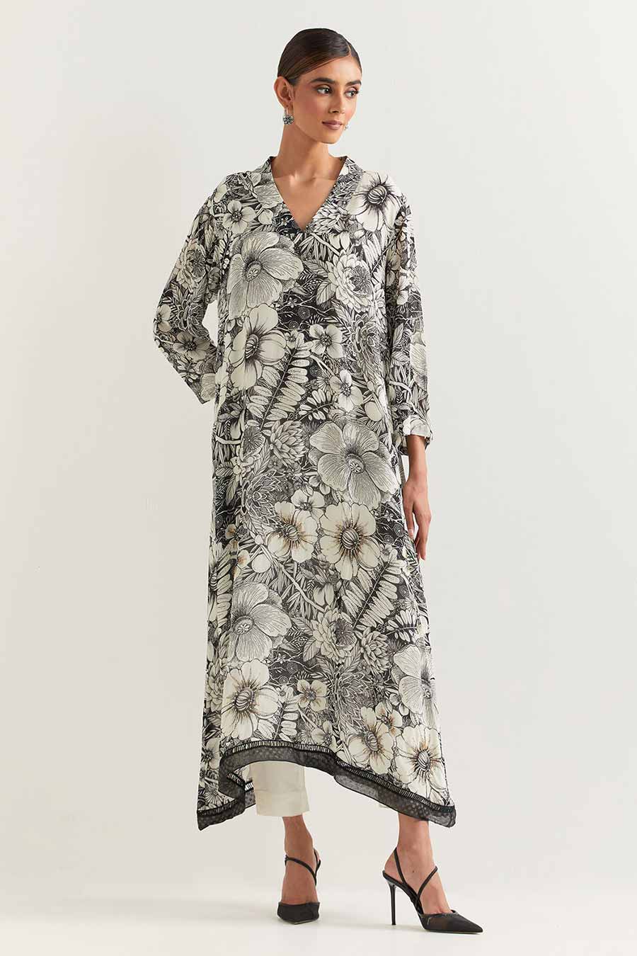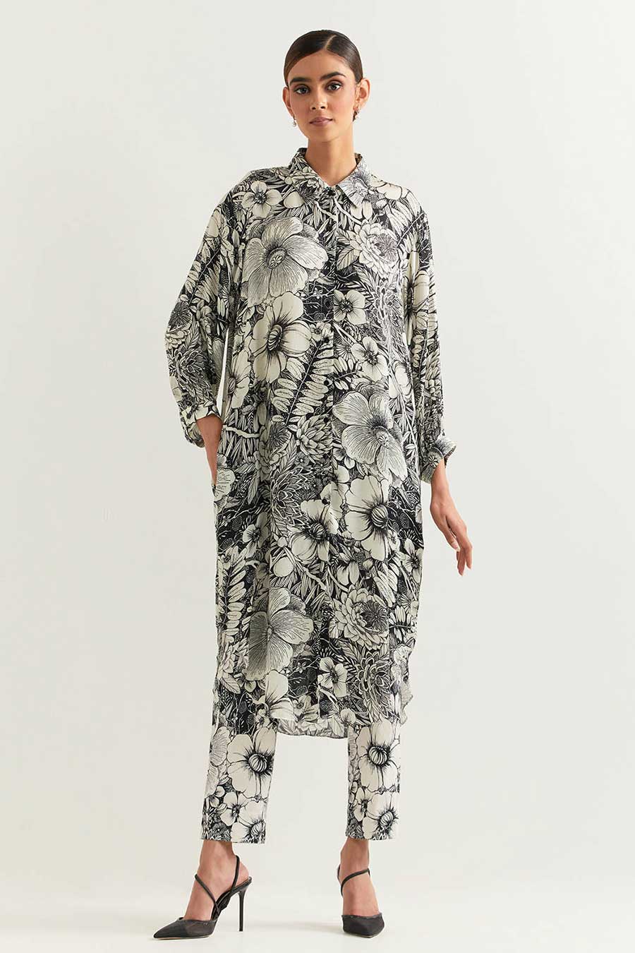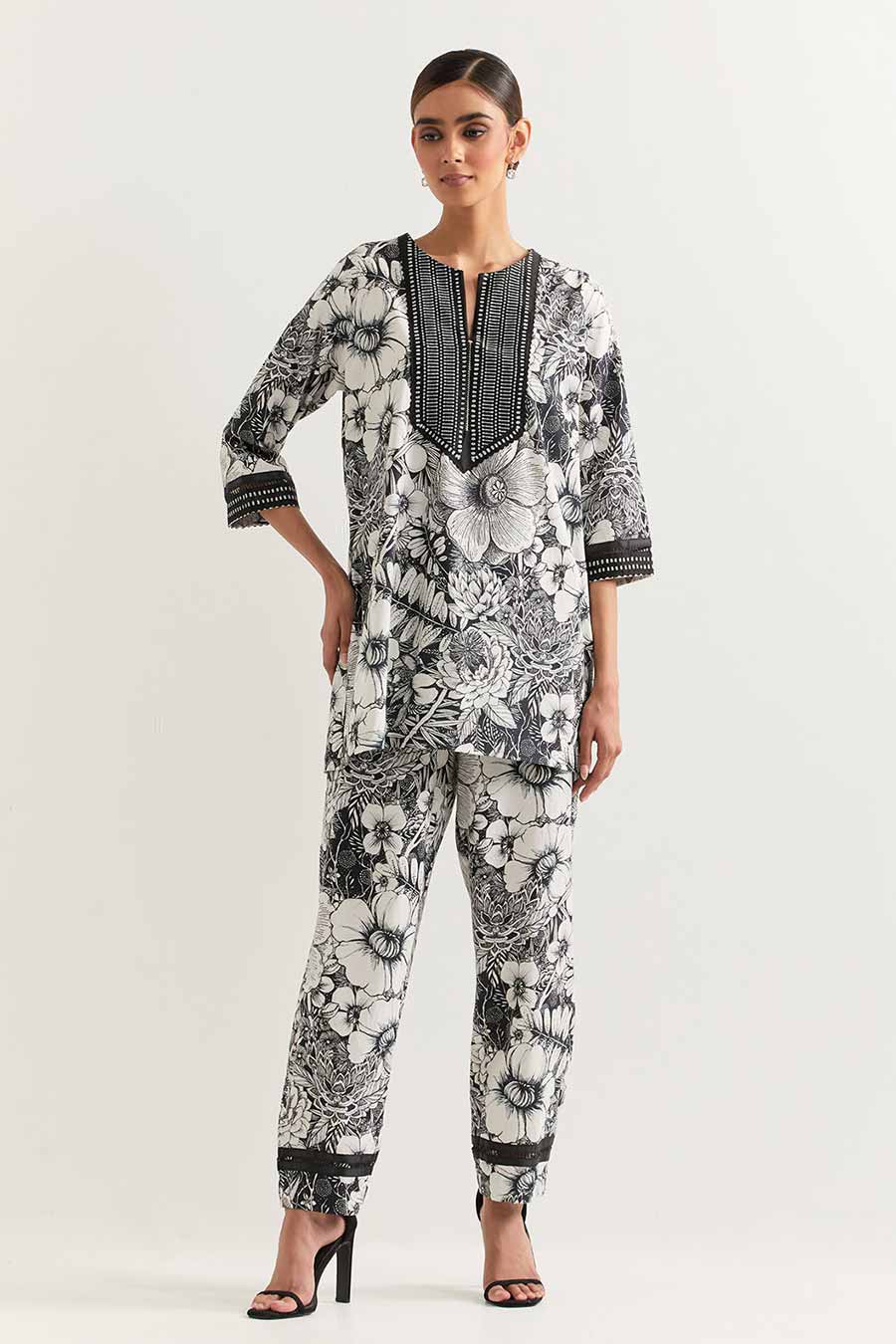 Black & White Printed Tunic Dress With Ivory Pants