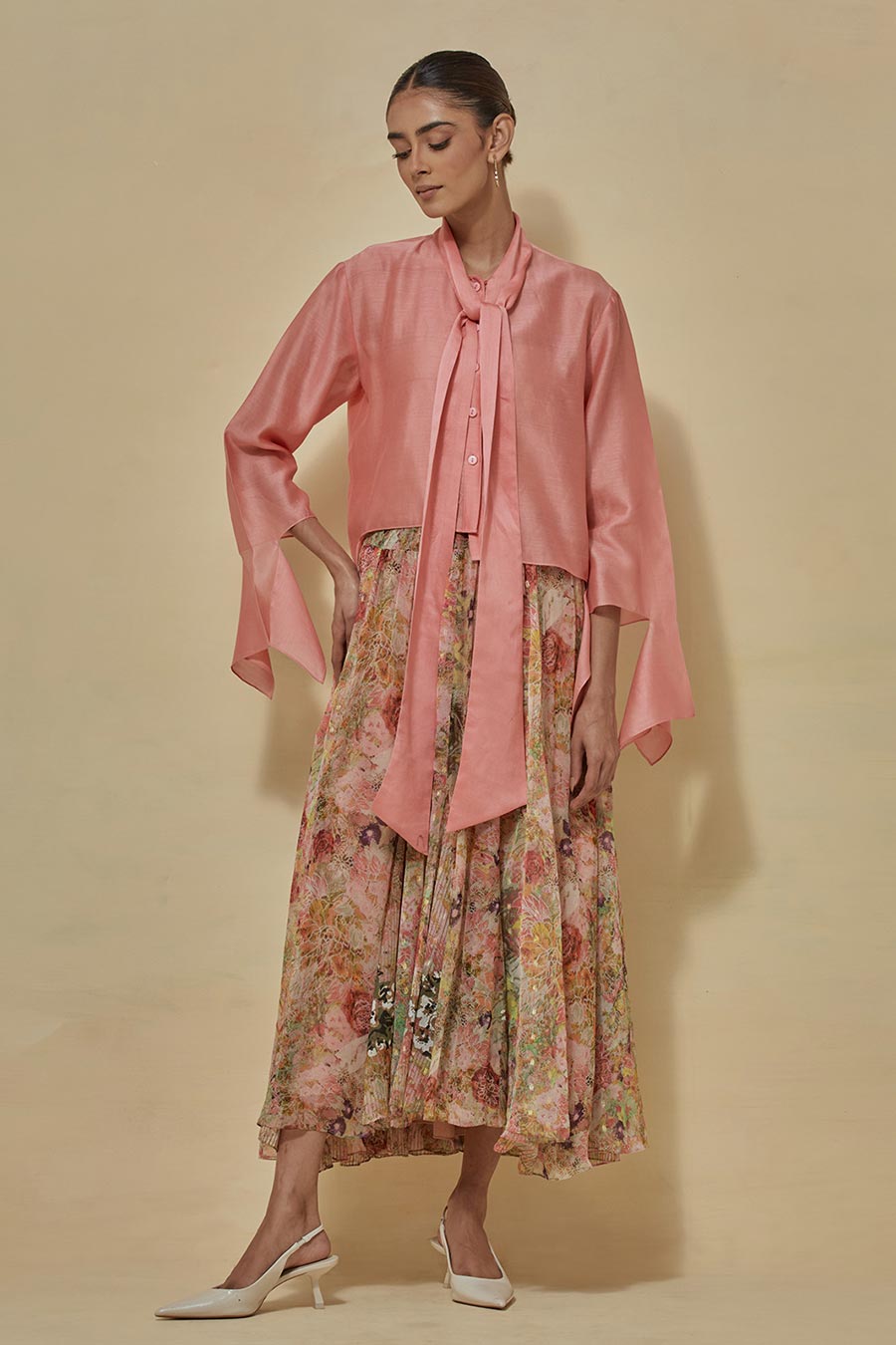 Coral Chanderi Shirt With Printed Chiffon Skirt