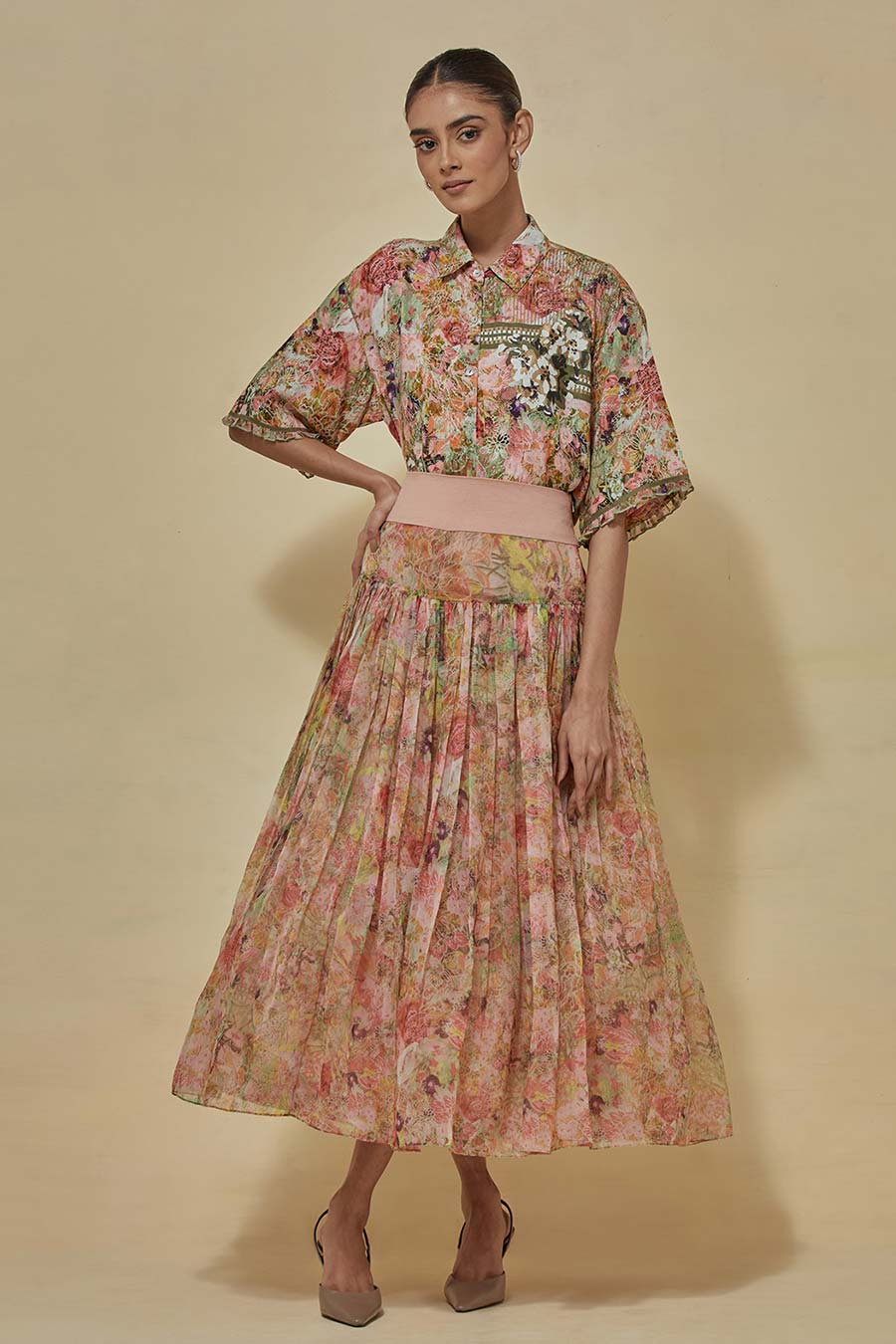 Printed Shirt With Organza Printed Skirt