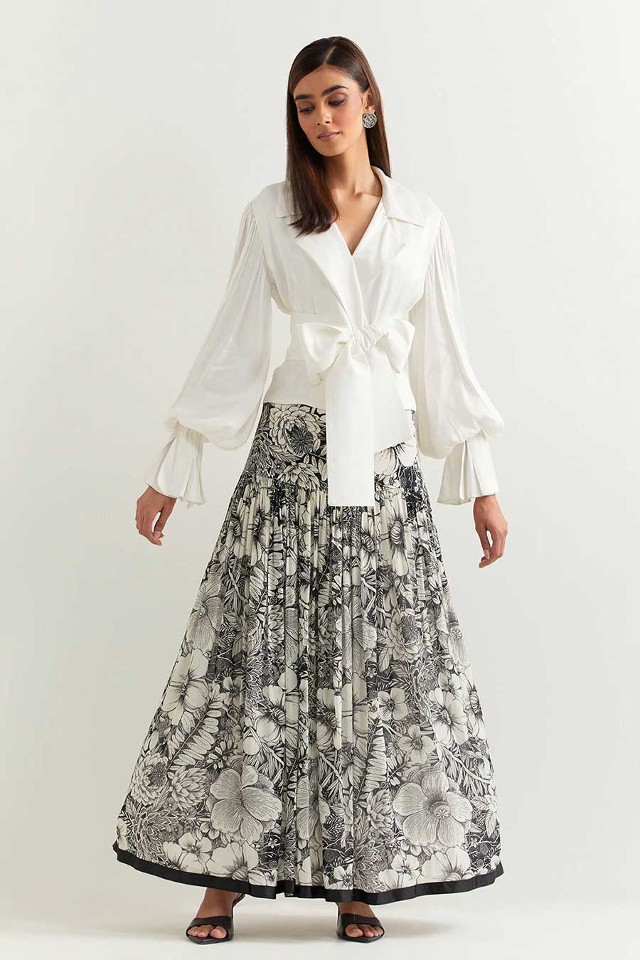 White Satin Top With Black & White Printed Skirt