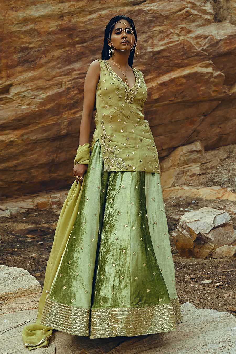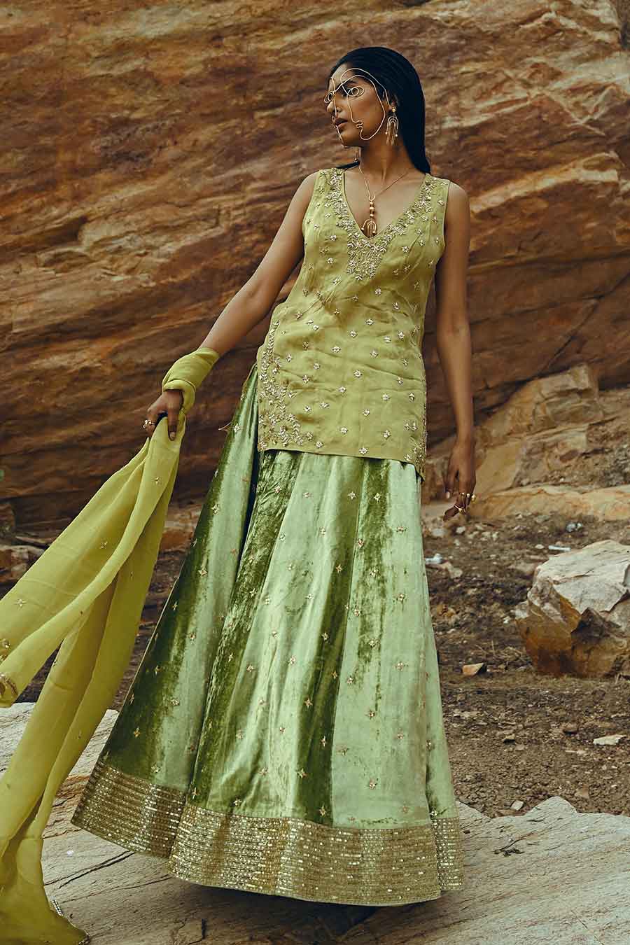 Green Velvet Embroidered Lehenga Set