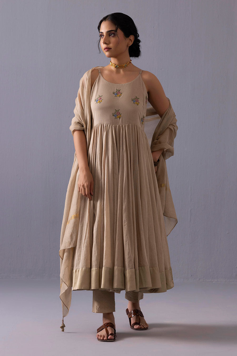 Sagarika Beige Chanderi Printed Kurta & Pant Set