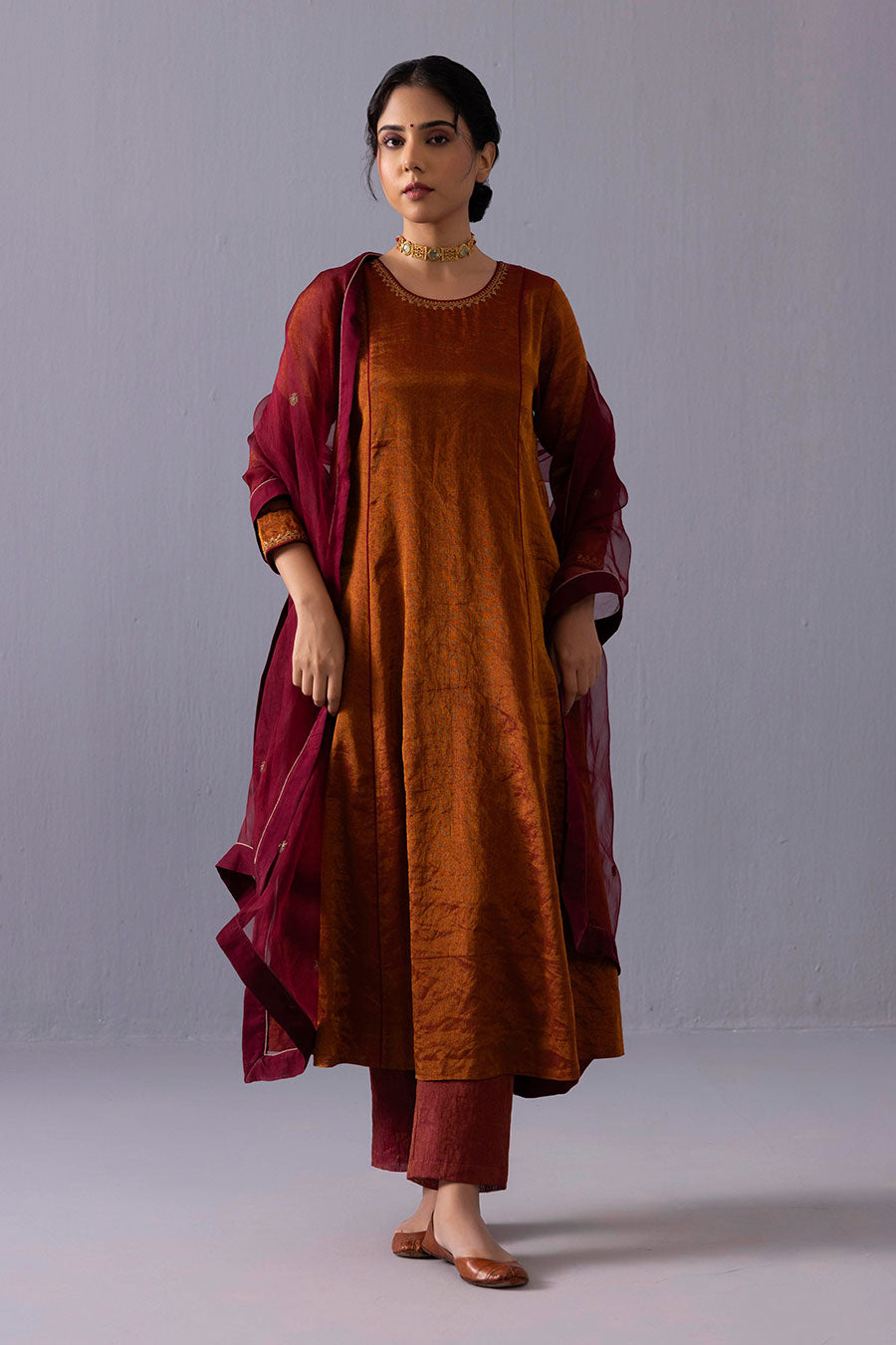 Orange Embellished Neck Cotton Silk Co-Ord Set