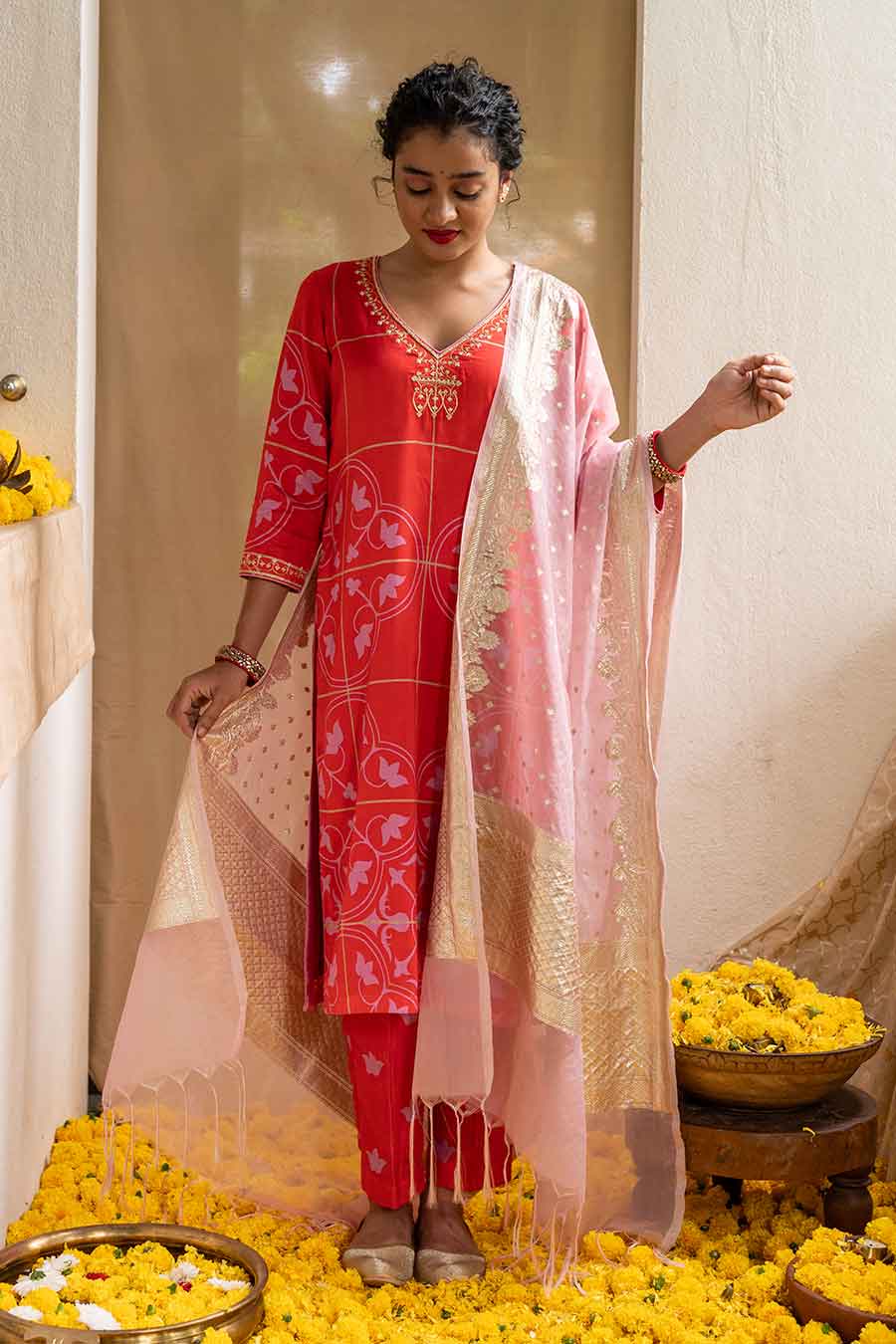 Red Ajrakh Blouse with Ruffled Dupatta and Pants