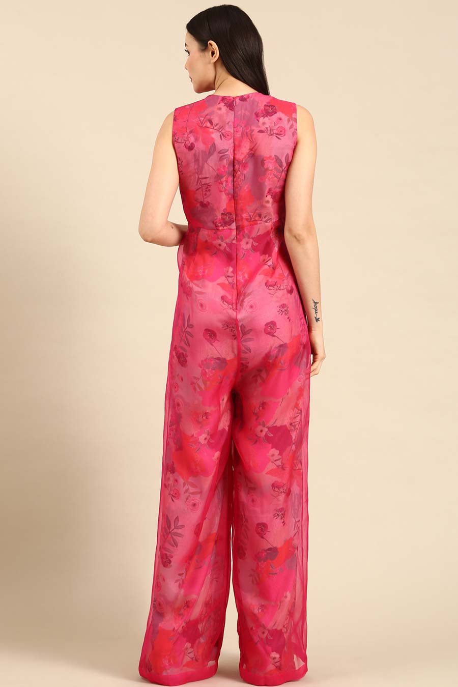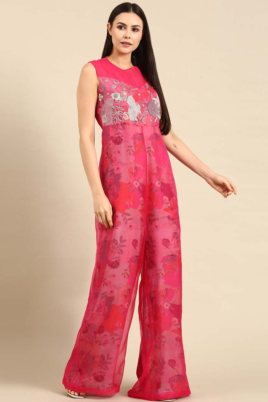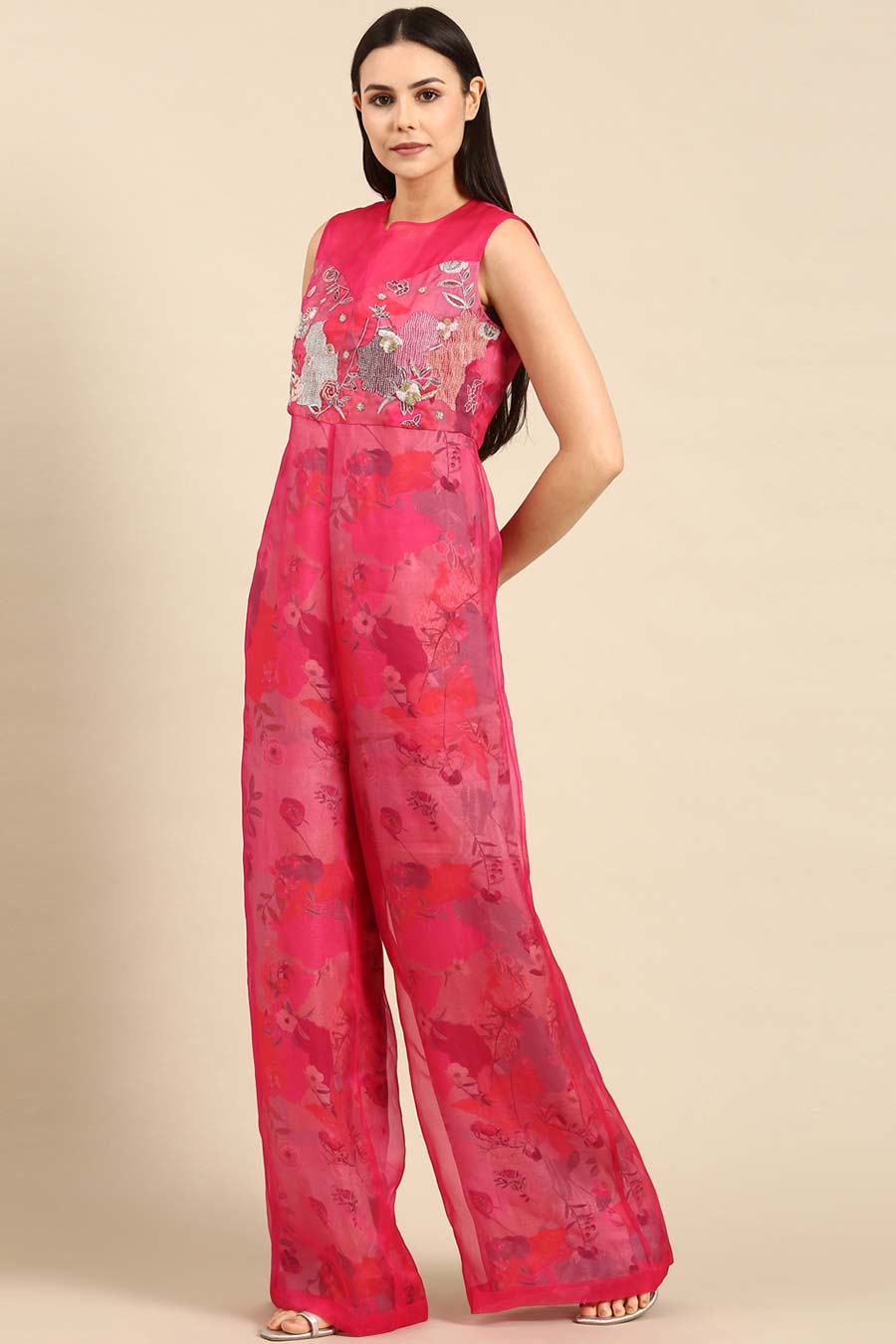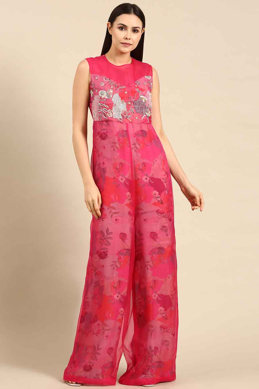 Pink Chanderi Embroidered Jumpsuit