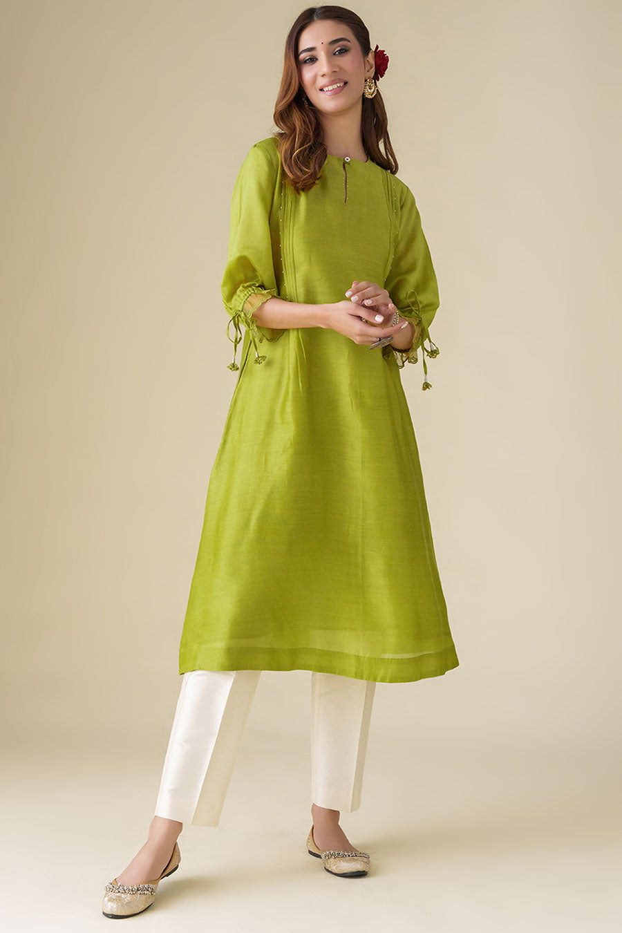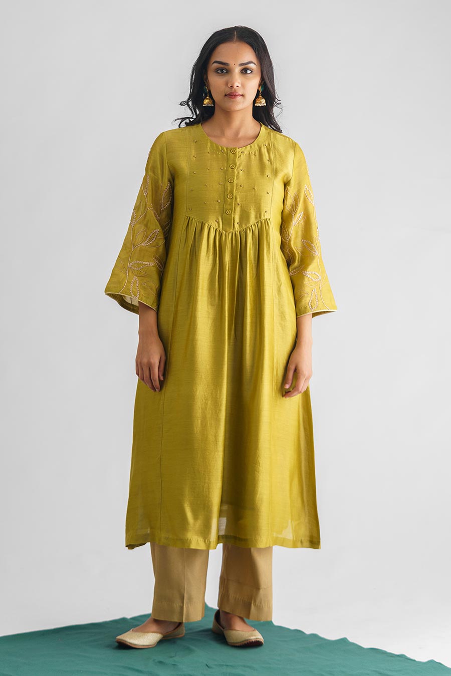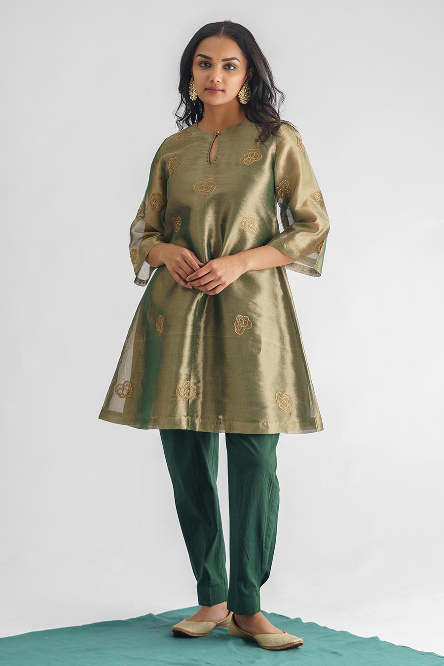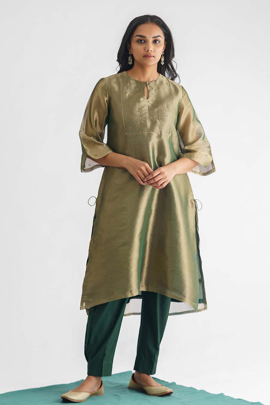 Bottle Green Bead & Sequins Embroidered Kurta With Slip