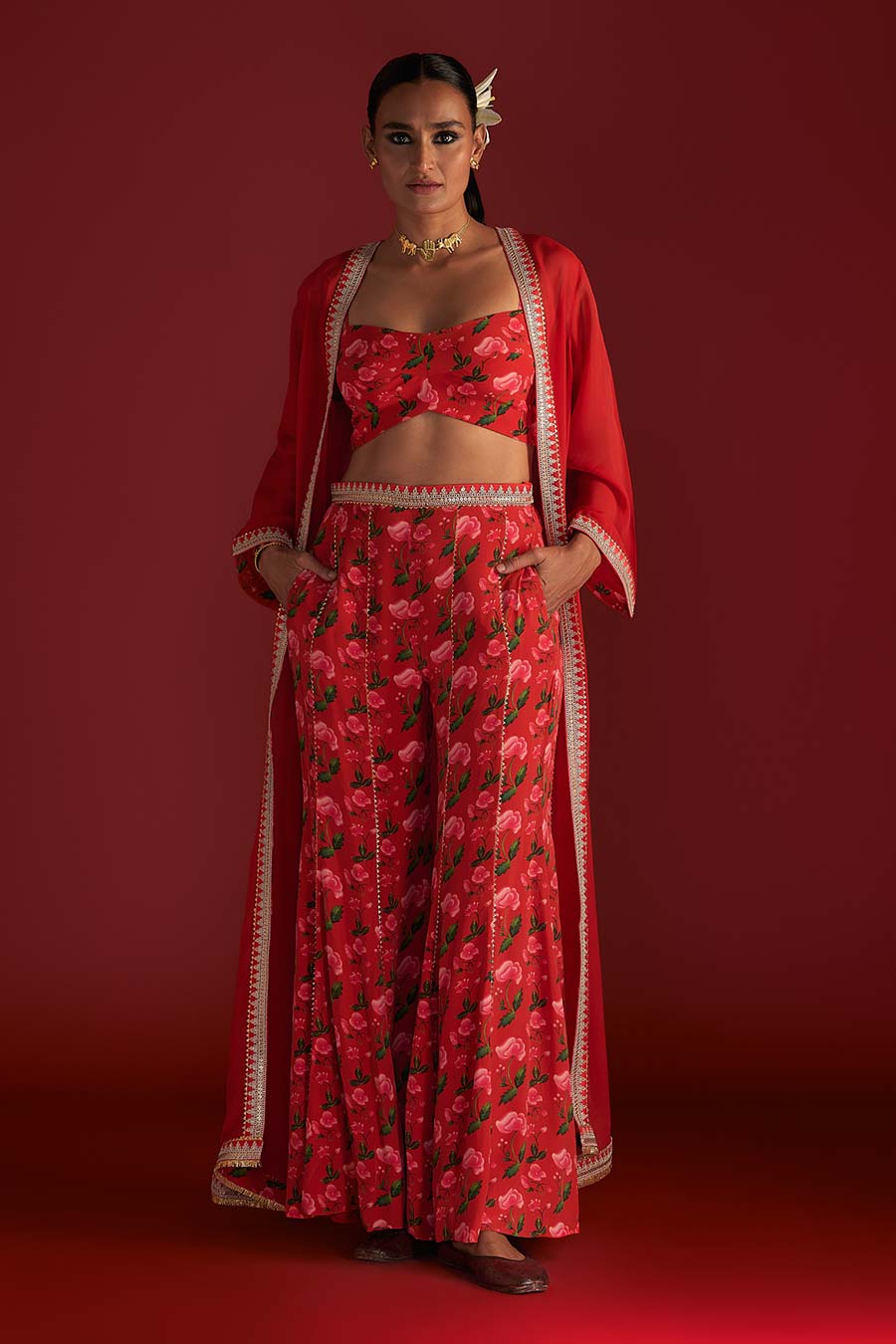 Red Rain Lily Embellished Co-Ord Set With Cape