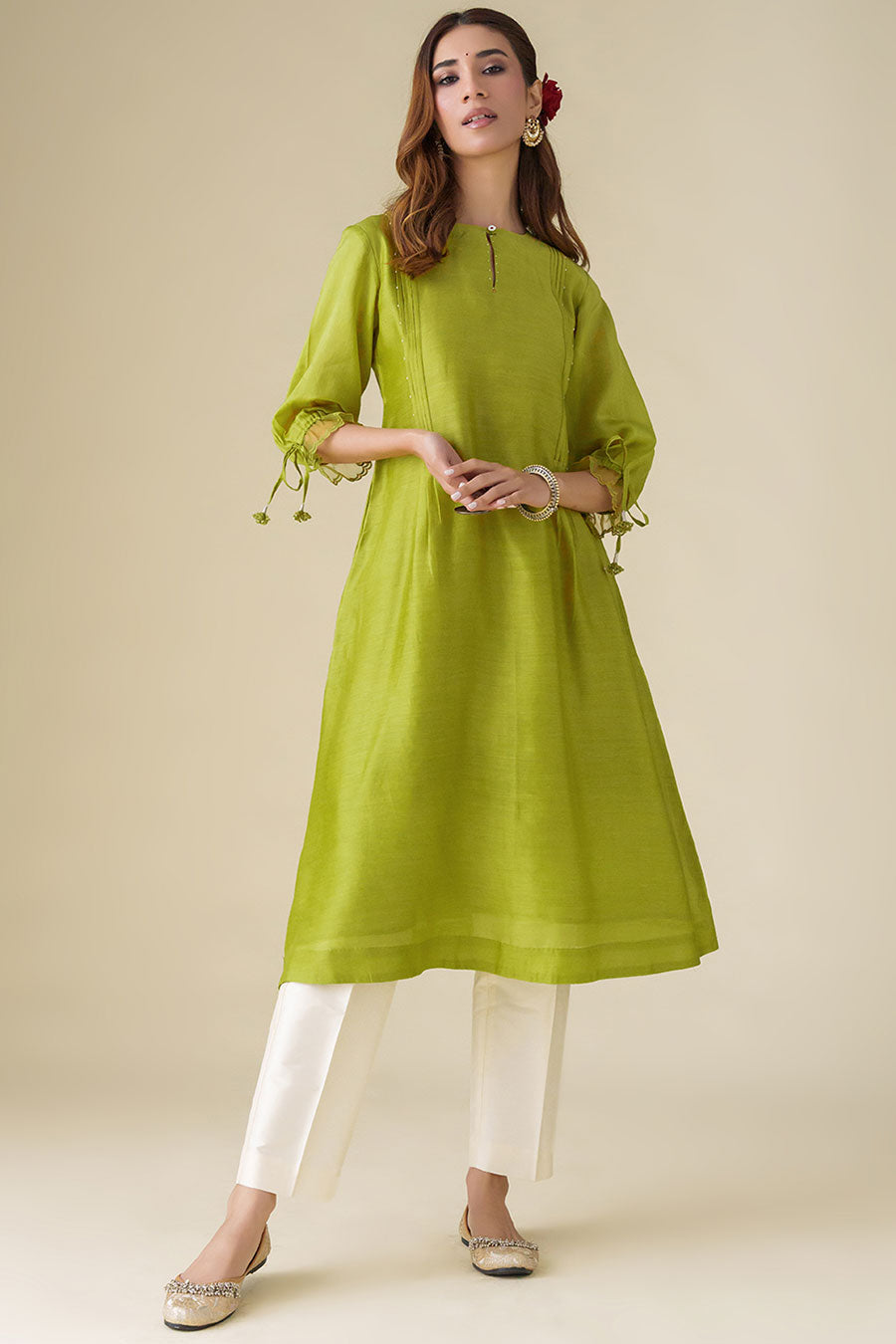 Lime Green Flowy Pintuck Kurta & Pant Set (Set of 2)