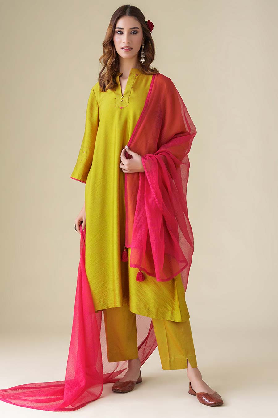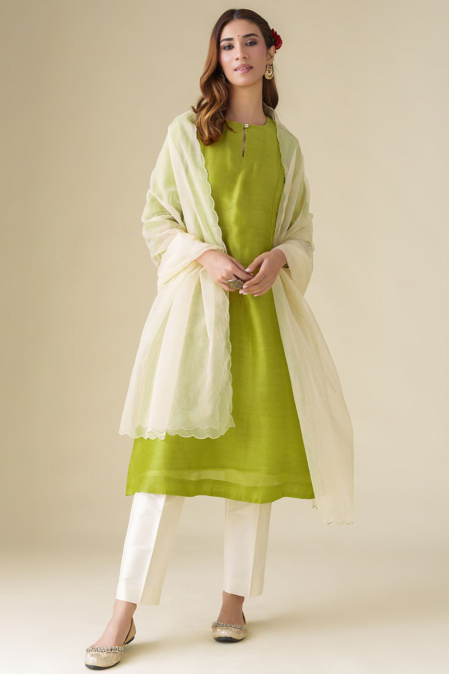 Lime Green Flowy Pintuck Kurta Set (Set of 3)