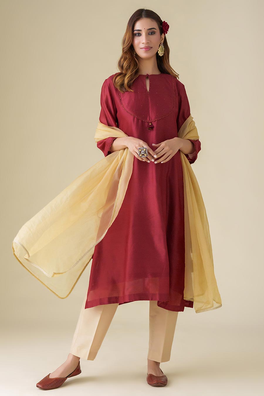 Maroon Hand-Embellished Kurta & Pant Set (Set of 2)