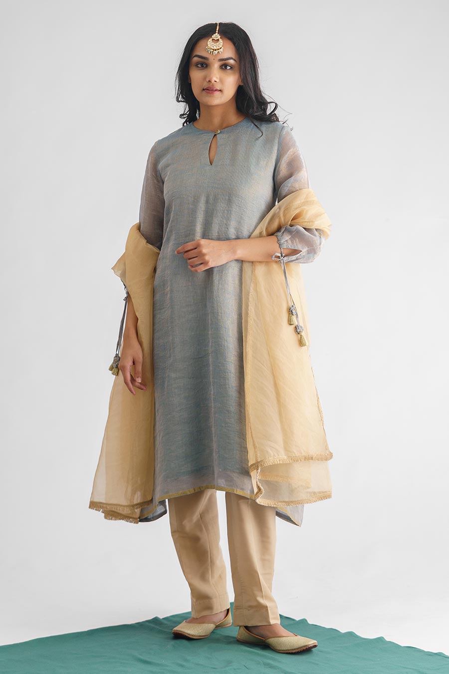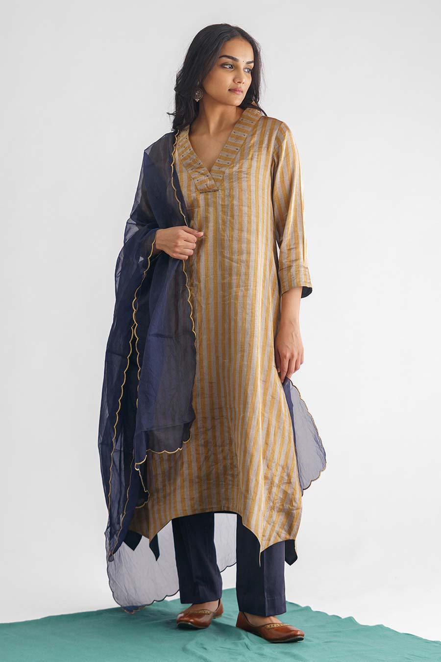 Grey & Gold Stripe Handwoven Kurta Set (Set of 3)