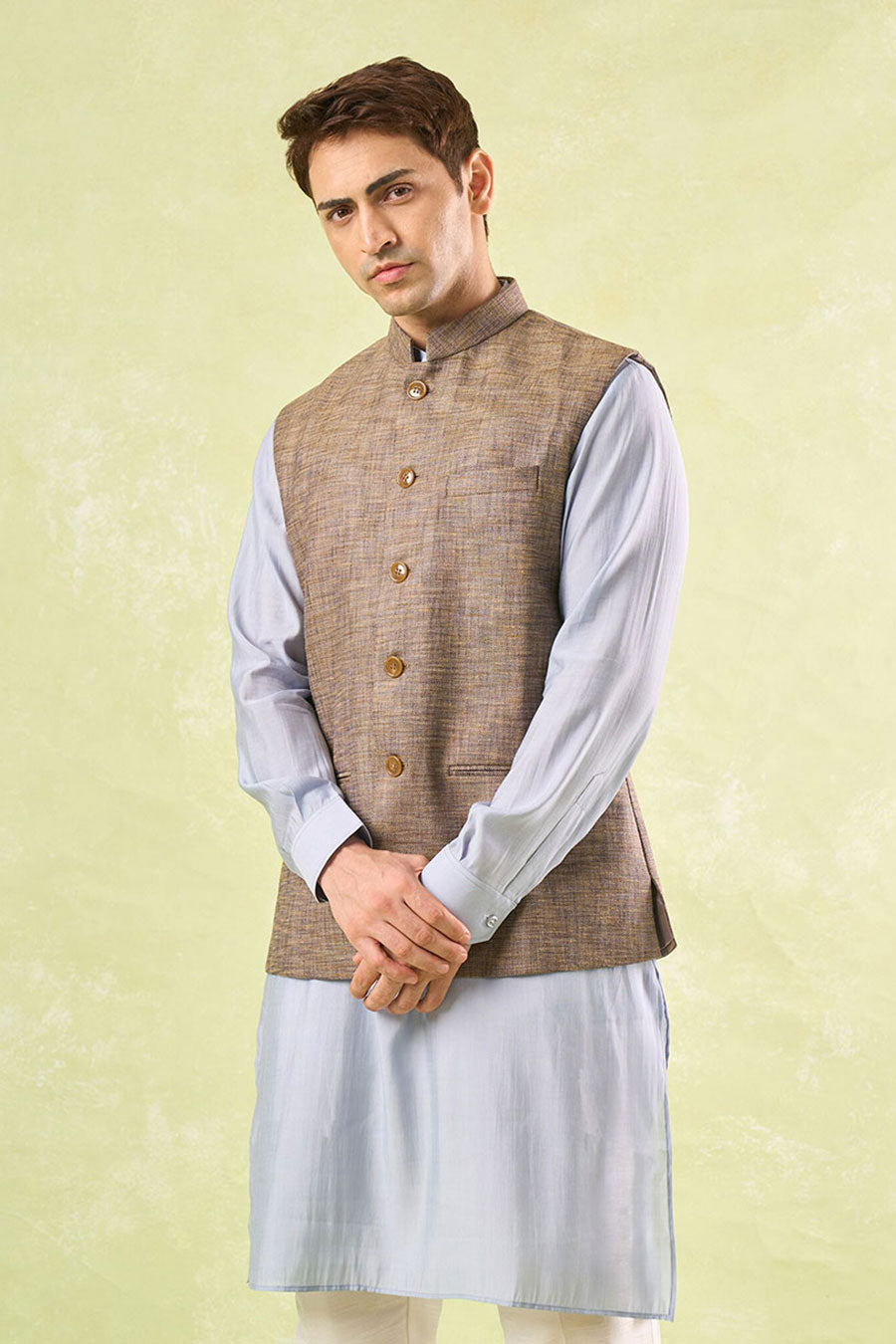 Man wearing an ethnic brown textured Bandi Nehru Jacket over a light grey shirt on a light green background