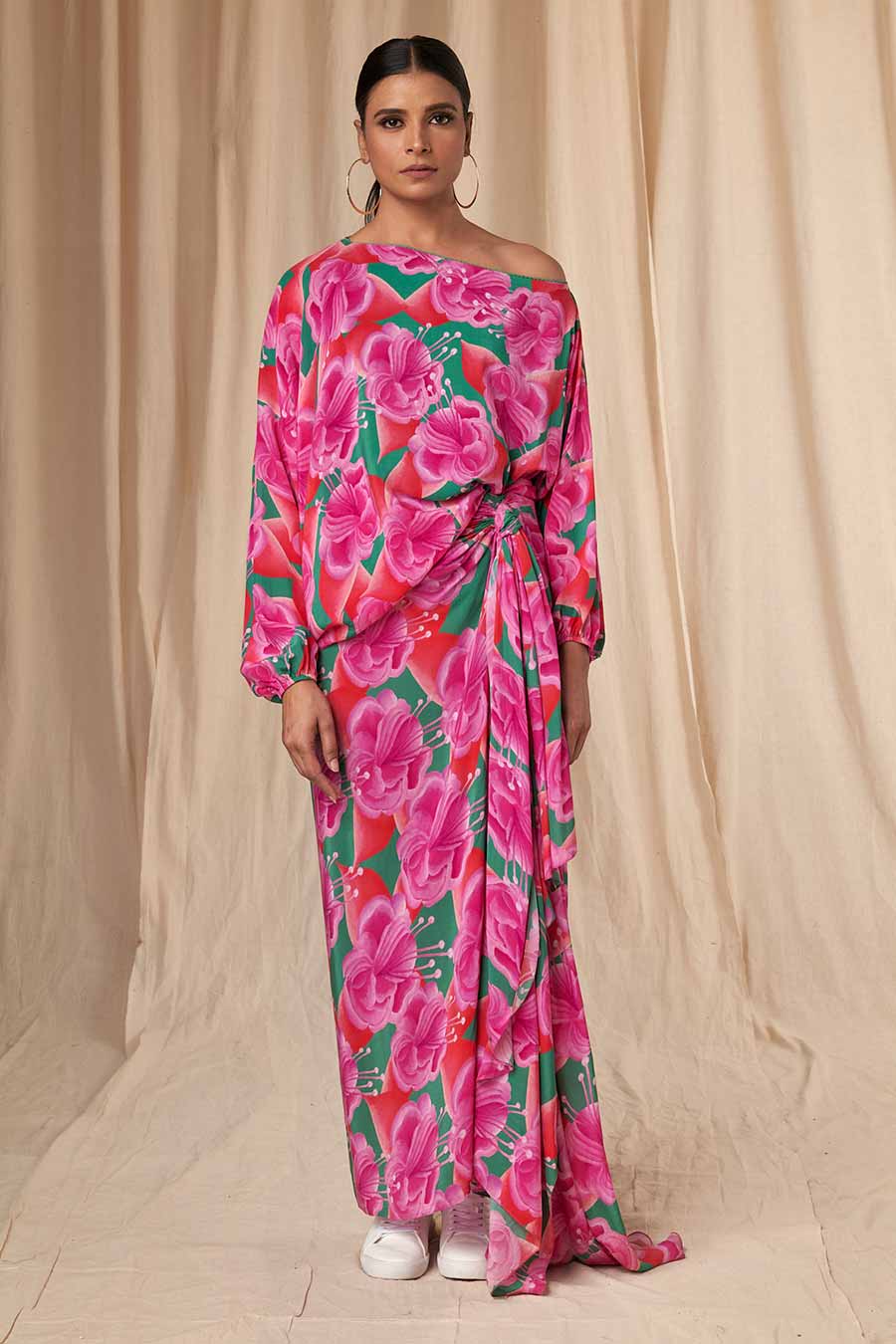 Pink-Green Bloomerang Kaftan Dress With Belt