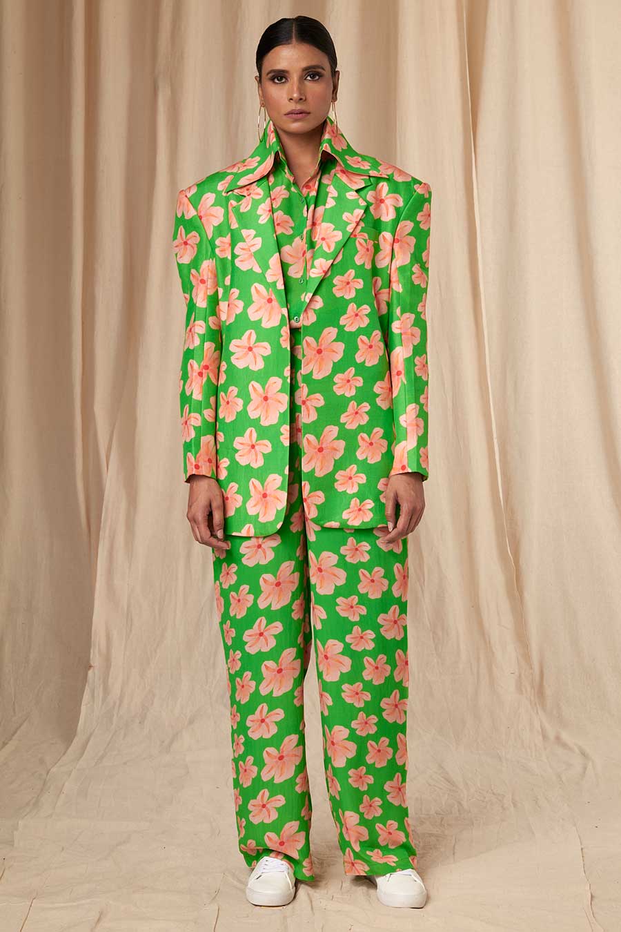Green Flower Passion Shirt Pants & Blazer Set (3Pc)