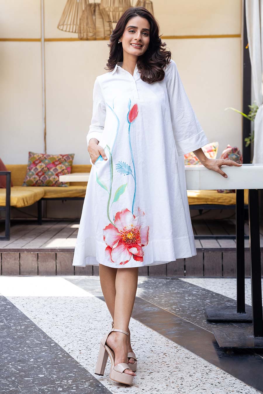 White Printed A-line Midi Dress