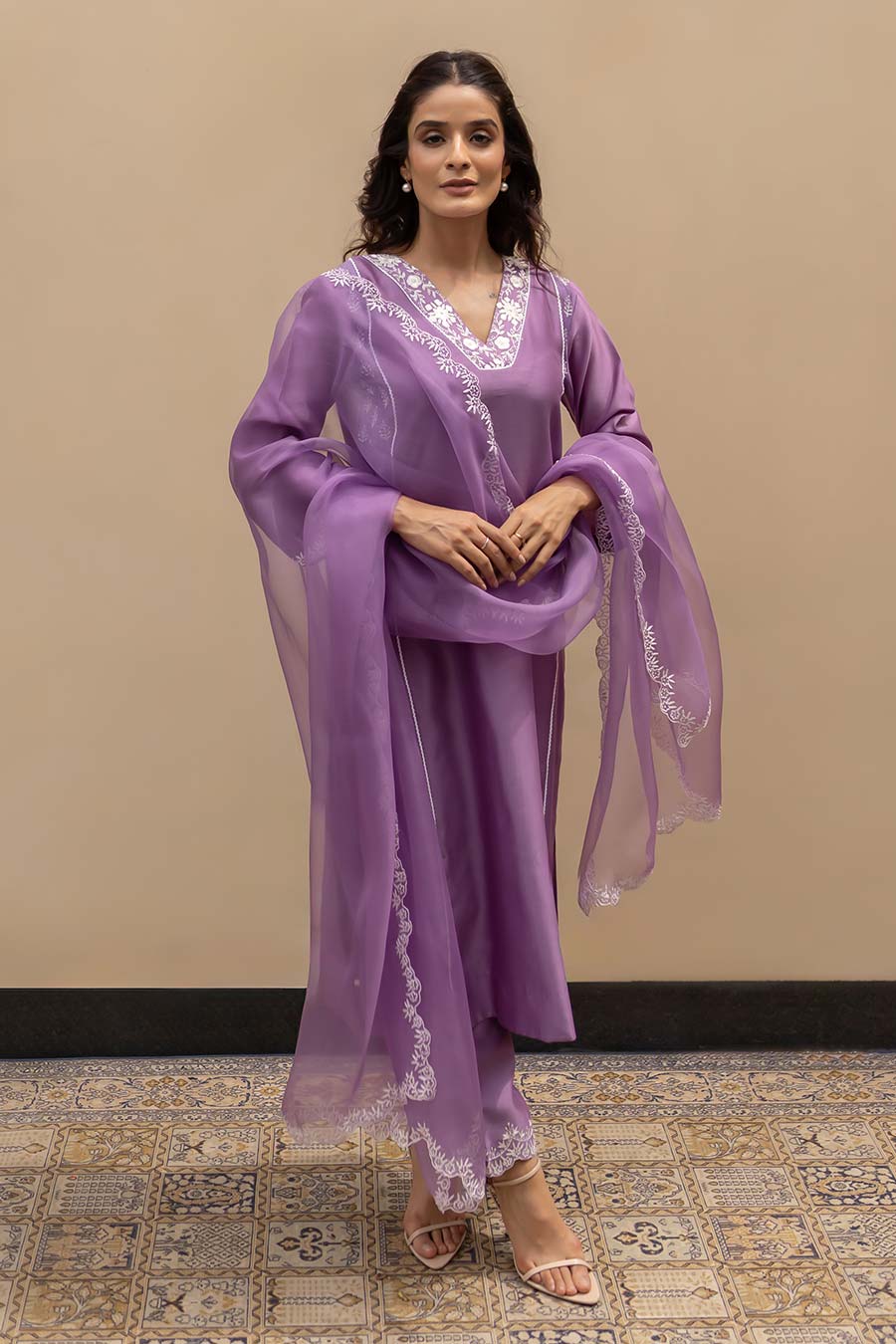 Lilac Chanderi Embroidered Kali Kurta Set