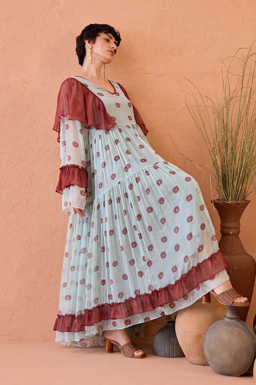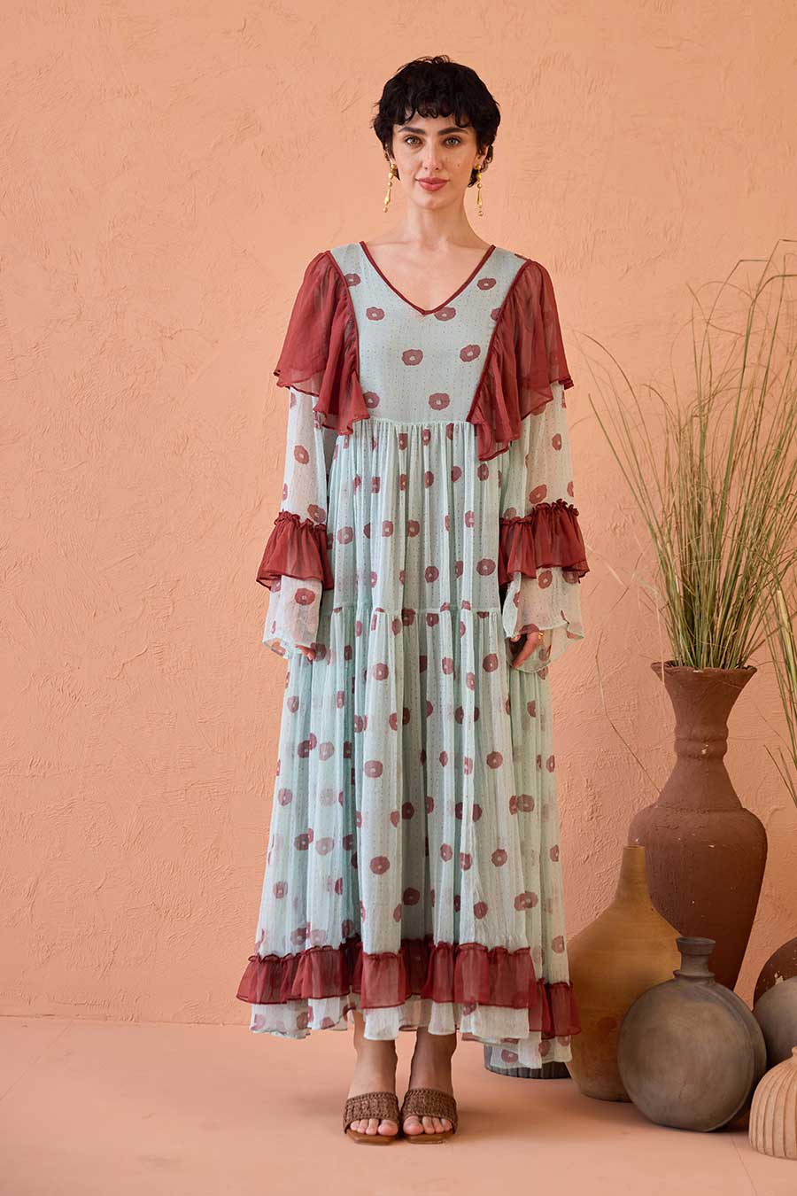 • Contrast ruffles in maroon on the sleeves and hemline