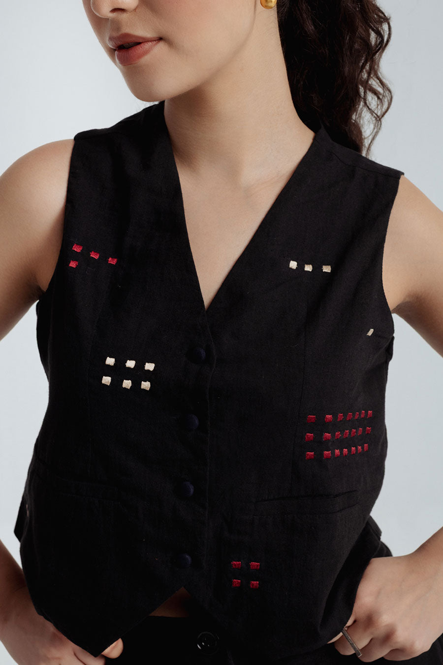 - Delicate hand-embroidery in red and beige hues