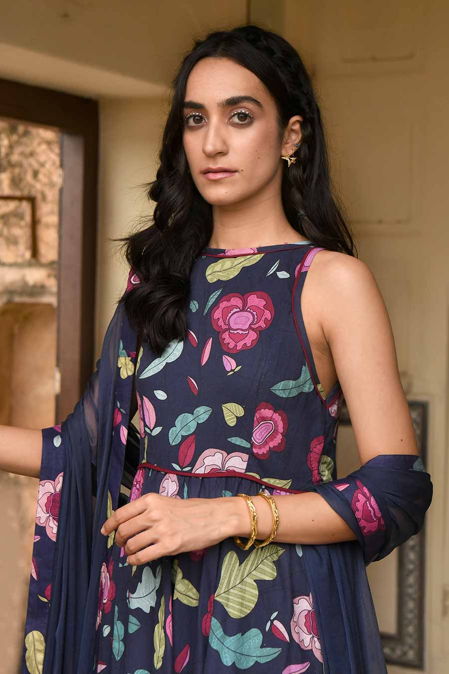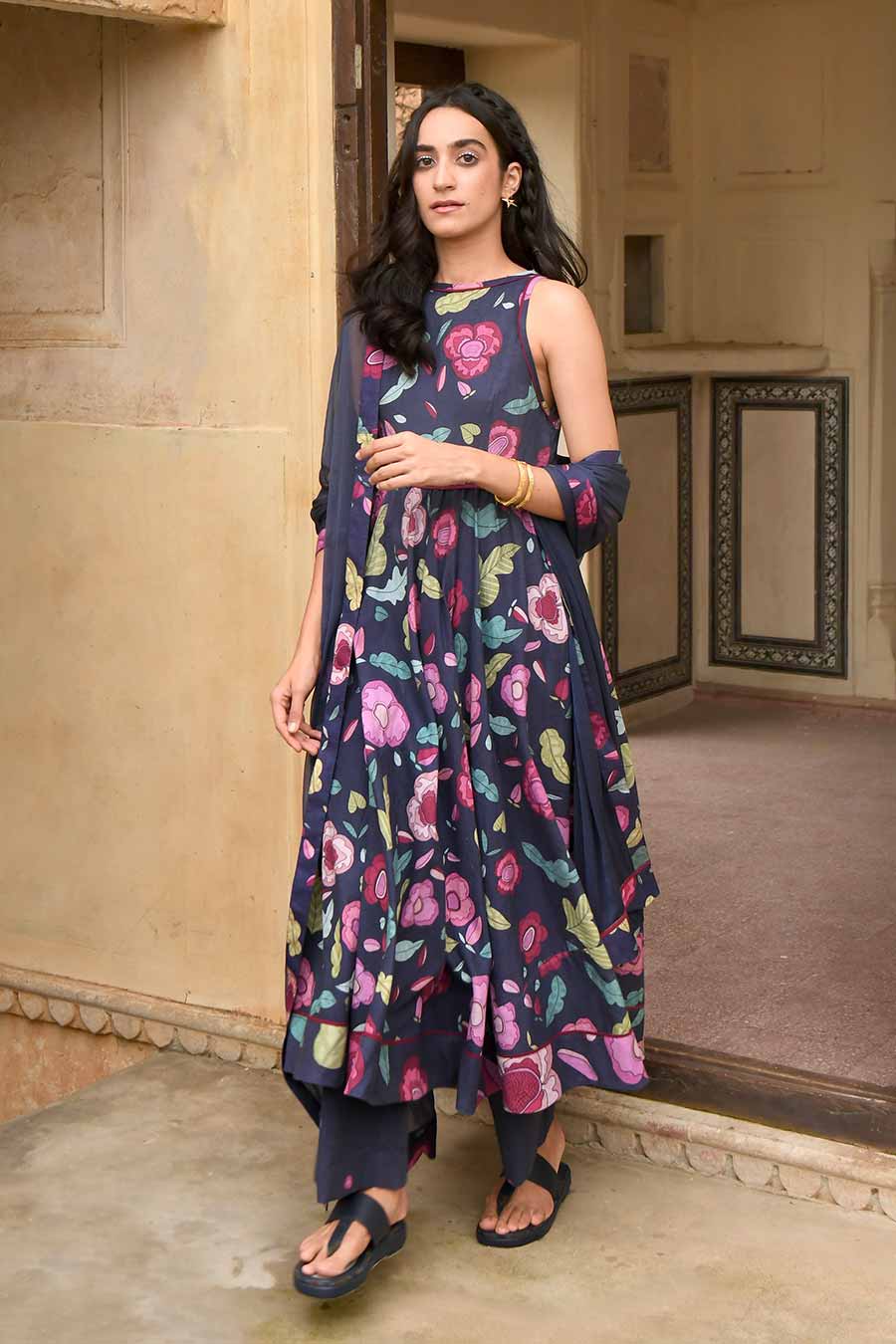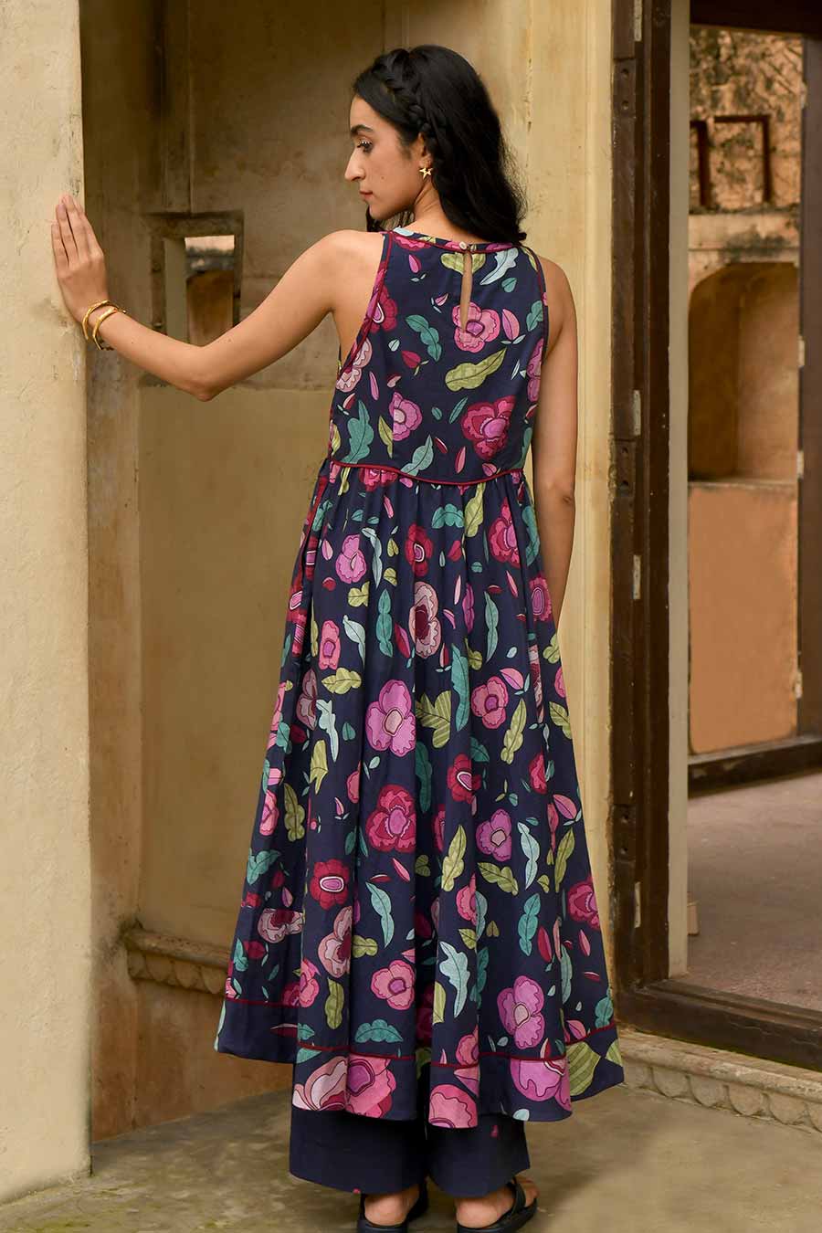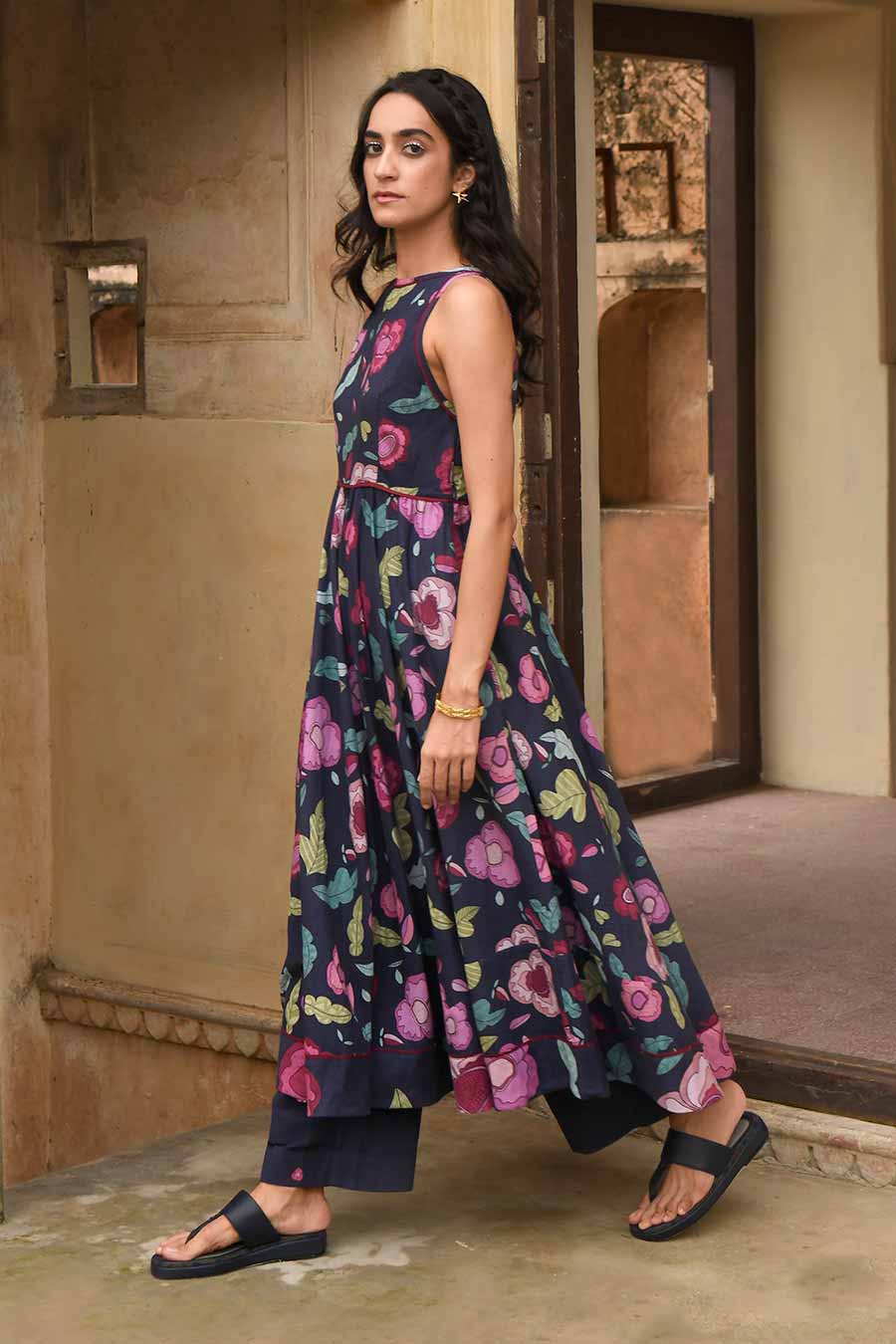- Sleeveless long kurta in light mulmul fabric with foliage print
