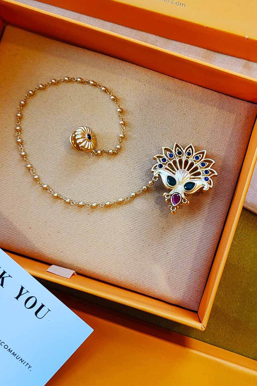 CARE INSTRUCTIONS: Avoid contact with moisture and the direct spray of perfumes. Store away after use in a box or pouch provided. Prevent the entangling of chains to avoid breakage and scratching. Wipe with a clean, dry cloth as required.